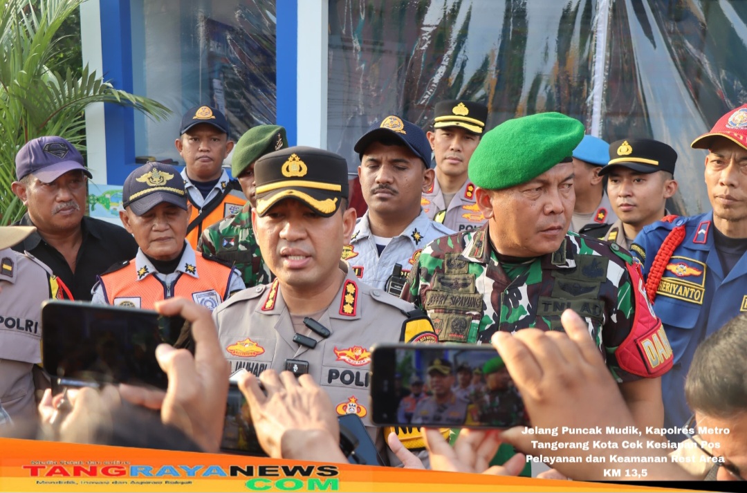 Kapolres Metro Tangerang Kota Kombes Pol Dr. Raden Muhammad Jauhari bersama jajaran TNI, Pemerintah Kota Tangerang serta instansi terkait melakukan pemantauan arus mudik Lebaran 2026 di Pos Pelayanan Rest Area KM 13,5 wilayah hukum Polsek Pinang, Minggu 15/3/2026 sore WIB.