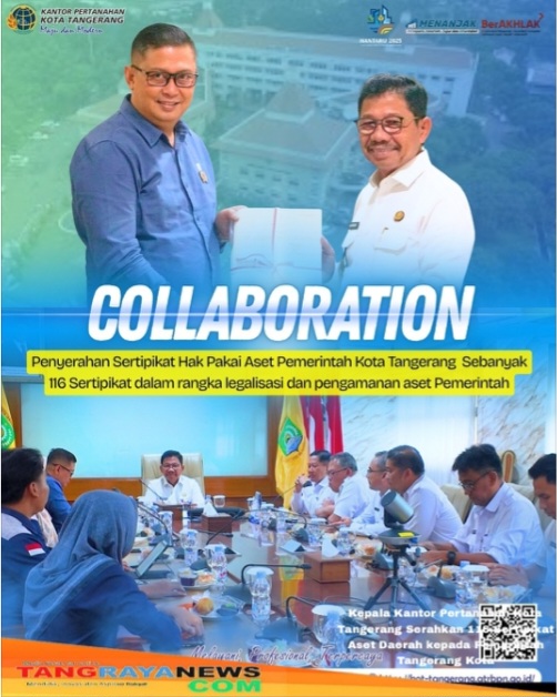 Upaya penguatan tata kelola aset daerah kembali ditunjukkan Kepala Kantor Pertanahan kepada Pemerintah Kota Tangerang di Ruang Rapat Wali Kota Tangerang, pada Rabu (12/11/2025), telah dilaksanakan penyerahan 116 sertipikat Hak Pakai atas aset milik Pemerintah Kota Tangerang yang diserahkan secara simbolis oleh Kepala Kantor Pertanahan Kota Tangerang, Tardi, S.SiT., M.H., kepada Wali Kota Tangerang,Drs. H. Sachrudin.