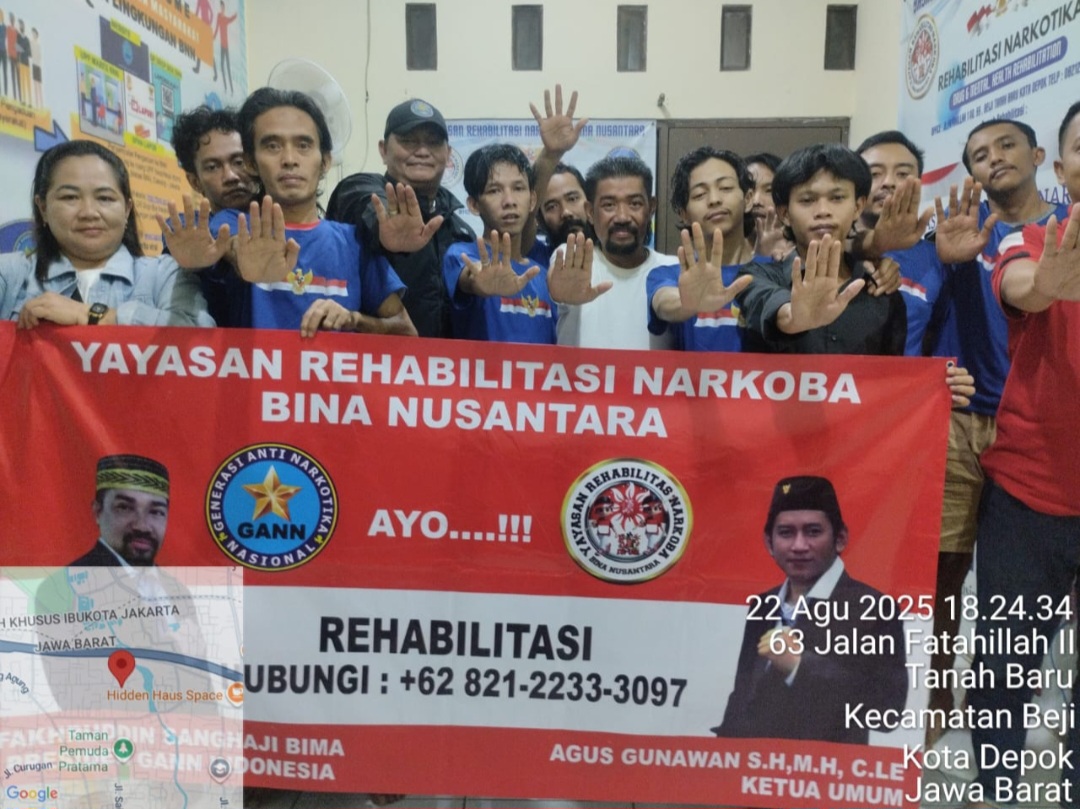 Dalam upaya memperkuat sinergi pemberantasan penyalahgunaan narkotika dan memberikan dukungan moril kepada para korban kecanduan, Ketua Umum Gerakan Anti Narkotika Nasional (GANN),Sangaji Bima, bersama jajaran pengurus GANN, melakukan kunjungan resmi ke Yayasan Rehabilitasi Narkotika Bina Nusantara, yang berlokasi di Jalan Fatahillah I No. 55, Tanah Baru, Beji, Kota Depok.Jum’at 22/08/2025.