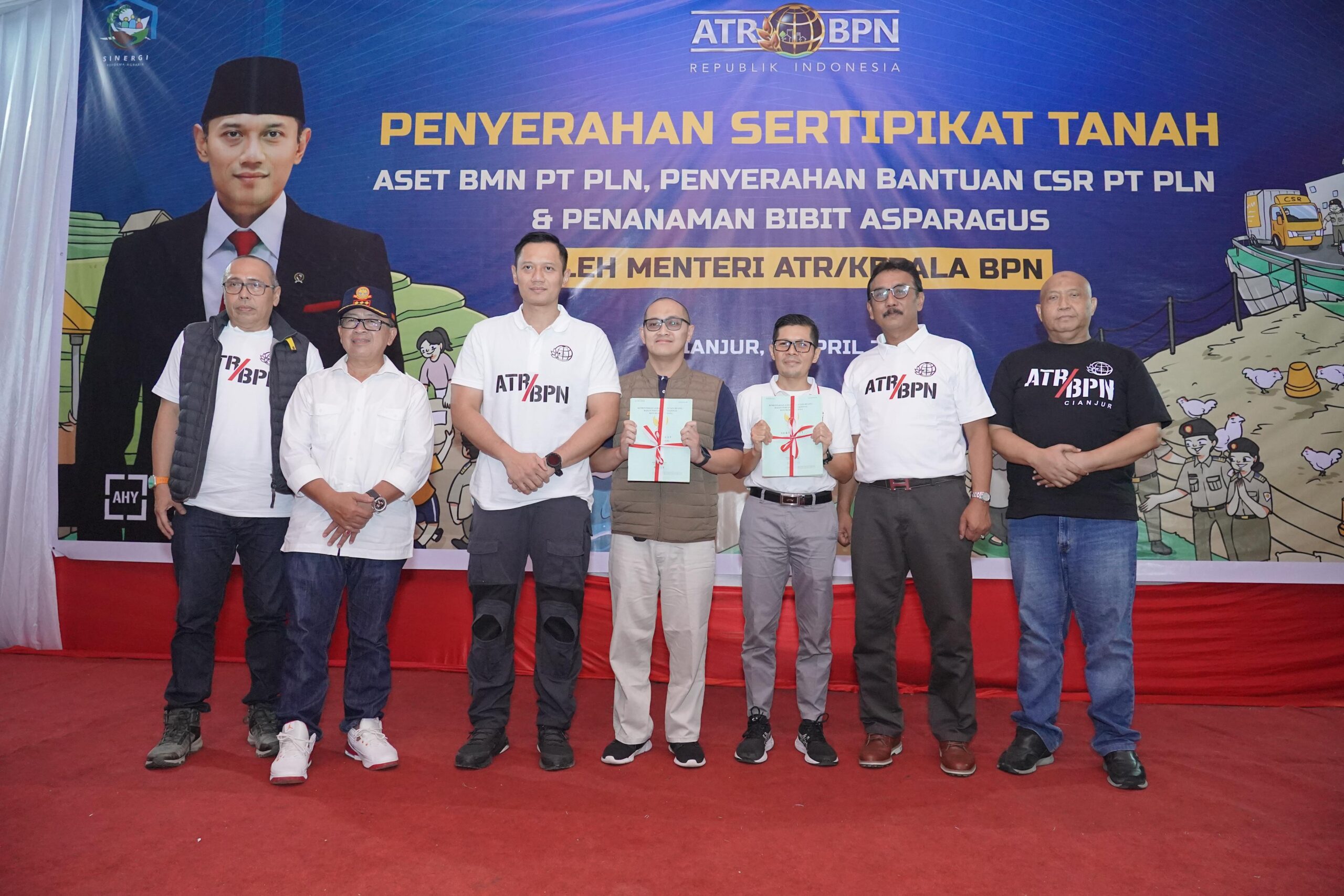 Menteri ATR/Kepala BPN, Agus Harimurti Yudhoyono (AHY) menyerahkan 11 sertipikat aset milik PT PLN Distribusi Jawa Barat pada Minggu (21/04/2024). Penyerahan ini dilangsungkan di Desa Cipendawa, Kecamatan Pacet, Kabupaten Cianjur.
