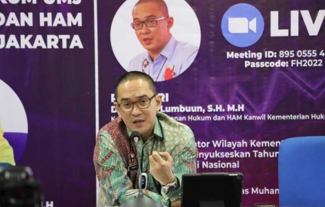 Kuliah umum yang bertema “Peran Strategis Kantor Wilayah Hukum dan HAM DKI Jakarta Mendukung dan Mensukseskan Tahun Hak Cipta 2022 sebagai Proses Pemulihan Ekonomi Nasional” direlai melalui youtube dan aplikasi zoom meeting, dan diikuti masyarakat luas, dosen, dan mahasiswa Hukum UMJ.