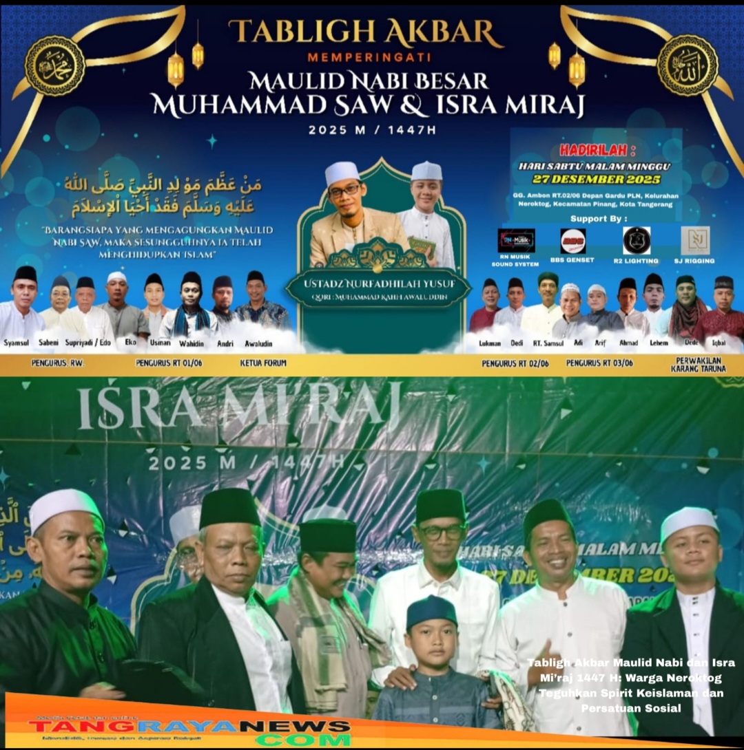 Semangat spiritual dan nilai kebersamaan umat Islam kembali menguat dalam Tabligh Akbar memperingati Maulid Nabi Besar Muhammad SAW dan Isra Mi’raj 1447 Hijriah / 2025 Masehi, yang digelar khidmat di Gang Ambon RT 02/06, depan Gardu PLN, Kelurahan Neroktog, Kecamatan Pinang, Kota Tangerang, pada Sabtu malam.12/12/2025.