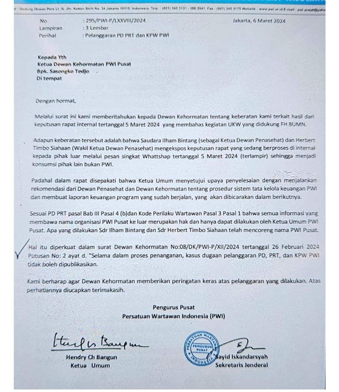 “Tindakan yang dilakukan oleh llham Bintang dan Herbet Timbo Siahaan dianggap merusak nama baik PWI Pusat,” begitu info sebagaimana tertulis dalam foto surat yang ditujukan kepada Ketua Dewan Kehormatan PWI.