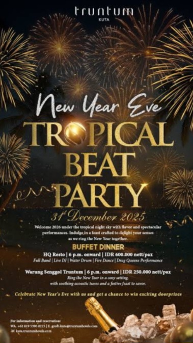 Lebih dari sekadar perayaan, acara ini dimaknai sebagai ruang refleksi kolektif atas perjalanan satu tahun yang telah dilalui, sekaligus simbol harapan baru menuju masa depan yang lebih inklusif, kreatif, dan berdaya saing global Pengan konsep yang matang dan pendekatan yang berorientasi pada kualitas pengalaman, New Year Eve Tropical Beat Party 2026 di Truntum kuta diharapkan menjadi salah satu agenda pergantian tahun yang berkesan, bermakna, dan memberīkan kontrībusi positif bagi dunia pariwisata Indonesia,